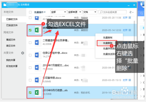 勾选“已领受文件”中的EXCEL文件,然后点击鼠标右键在弹出的操作选项中选择“批量删除”。