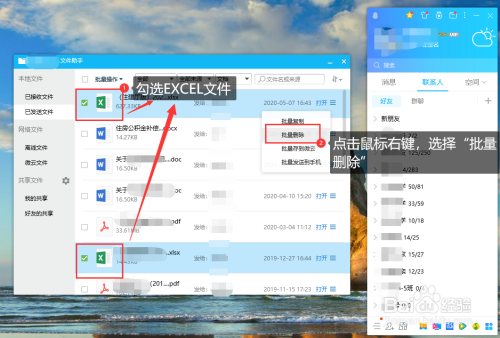 勾选“已发送文件”中的EXCEL文件,然后点击鼠标右键在弹出的操作选项中选择“批量删除”。