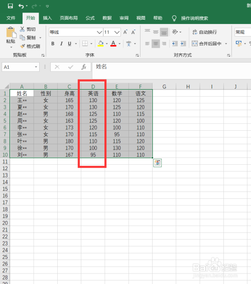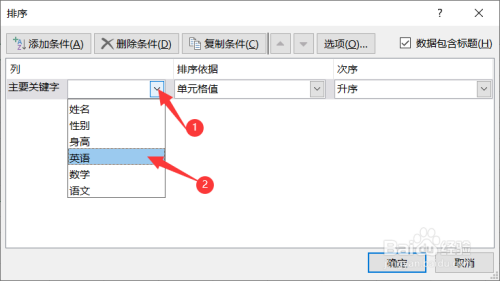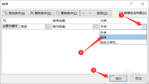 点击“次序”的下拉对话框图标,选择排序方为“降序”,即按英语成就从高到低的排序,点击“确定”