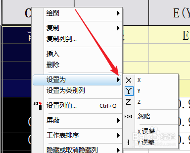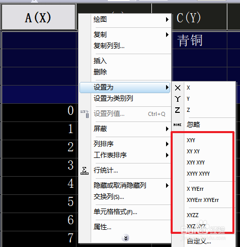 5. 在任一列上方右键可以看到Origin内置的设定体例。