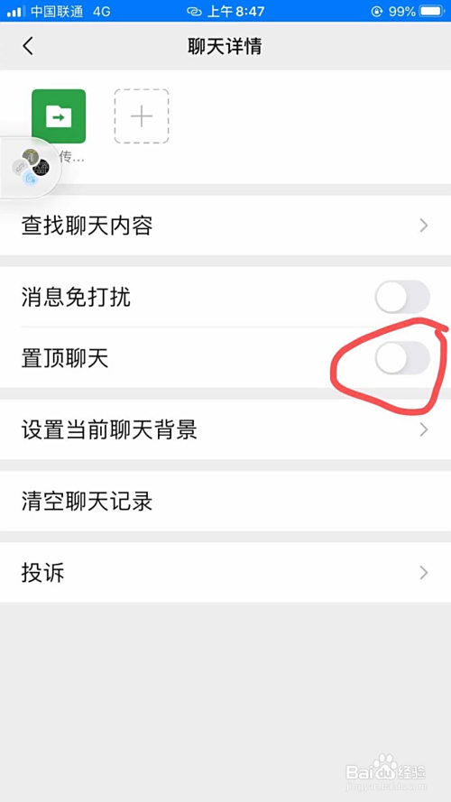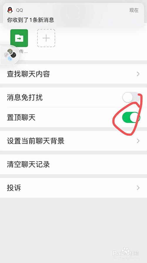 这里有一个置顶聊天的选项,把它打开,让它酿成绿色就可以了。