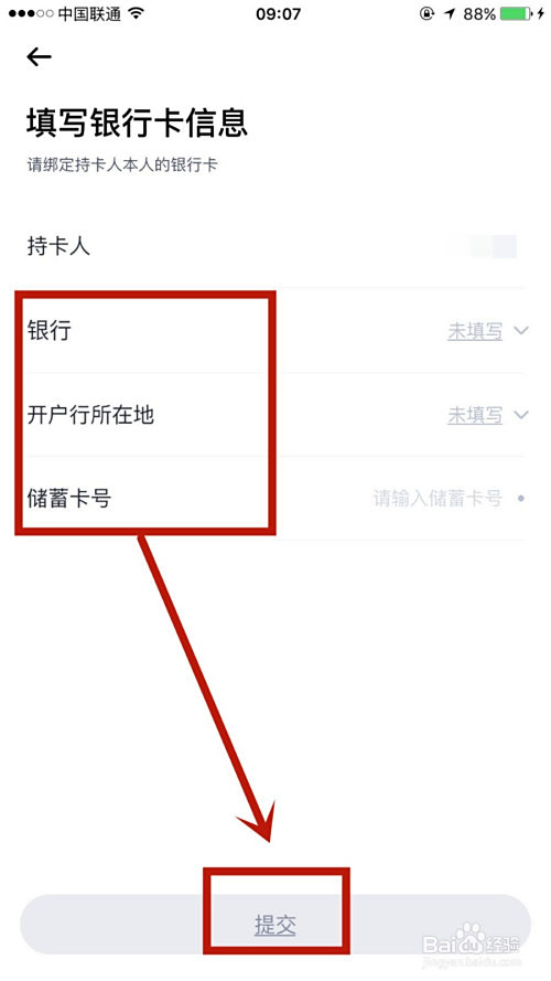 3.输入银行卡卡号跟所属地后点击下方的提交。