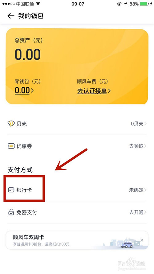 2.点击钱包,再点击银行卡进入+ 添加银行卡。
