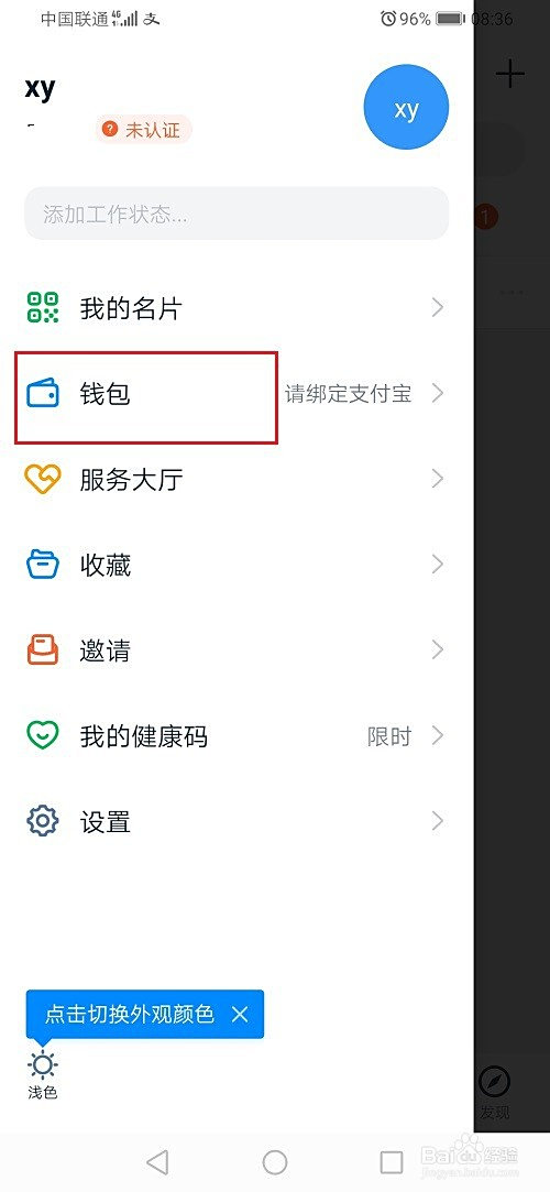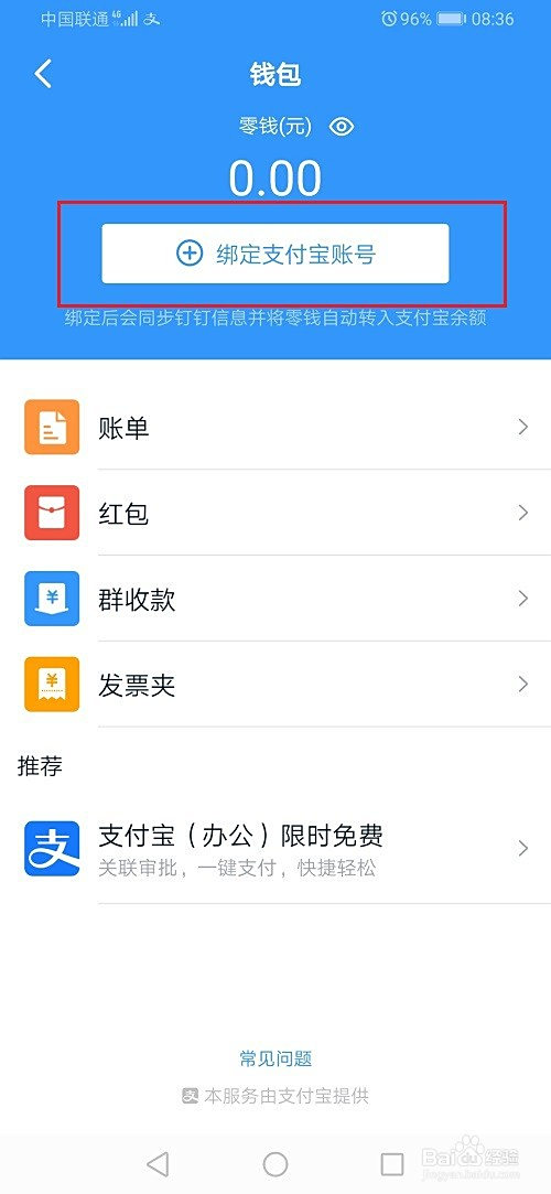 第三步在钉钉钱包界面,点击绑定支付宝账号,如下图所示: