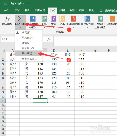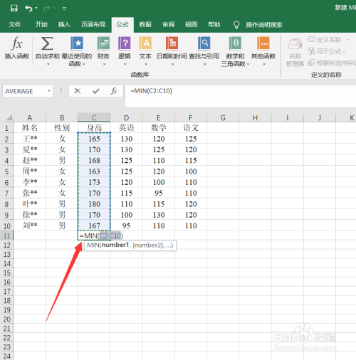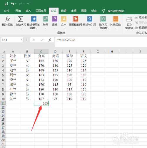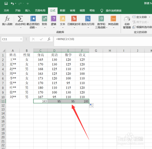 鼠标点击到要求最小值的系列的后边一个单位格,例如这里求身高的最小值