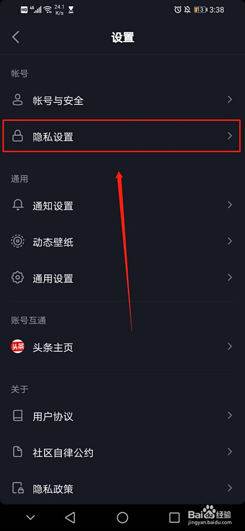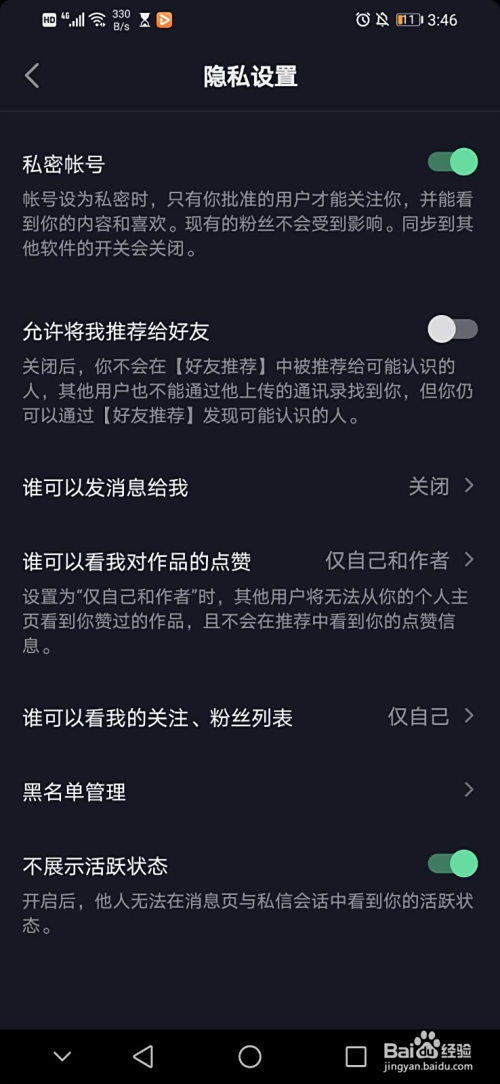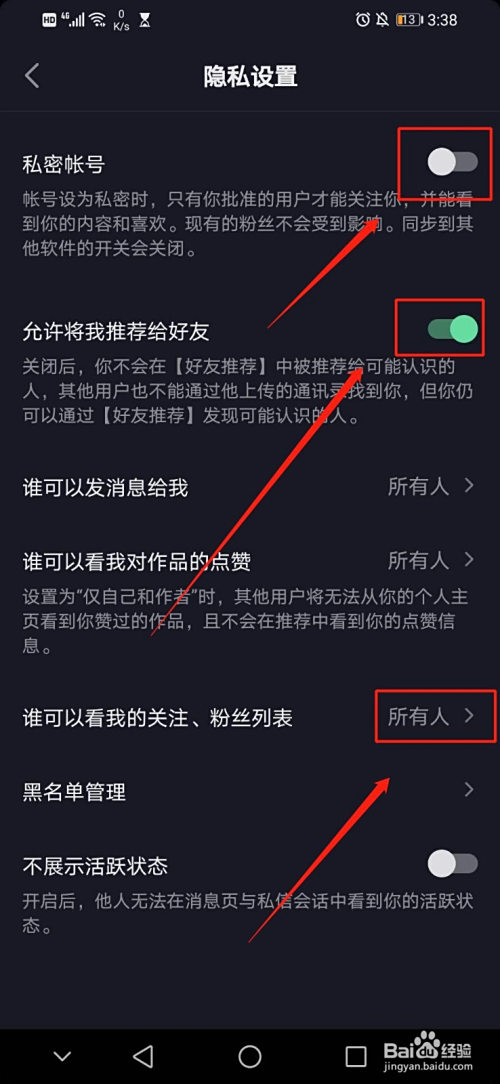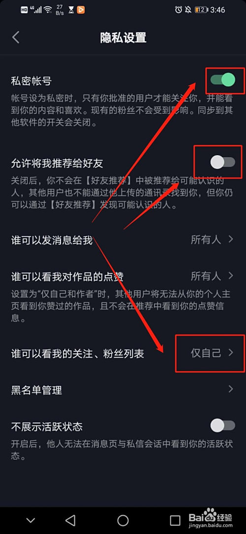 进入“隐私设置”界面后,分布点击“私密账号”、“许可将我保举给老友”、“谁可以看我的存眷、粉丝列”旁边的开启/封闭键或“>”图标,如图箭头所指。