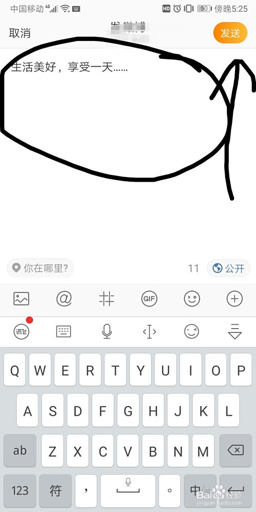 编纂想要发布的内容,可以写表情等等,同时还可以添加图片,然后点击右上角的“发布”。如图: