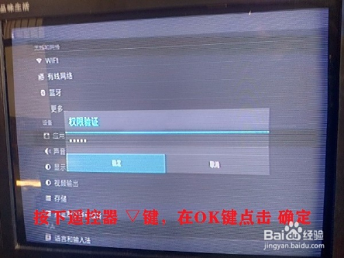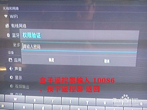 在设置页面,需要权限验证,用遥控器输入“10086”,按下“返回”键;