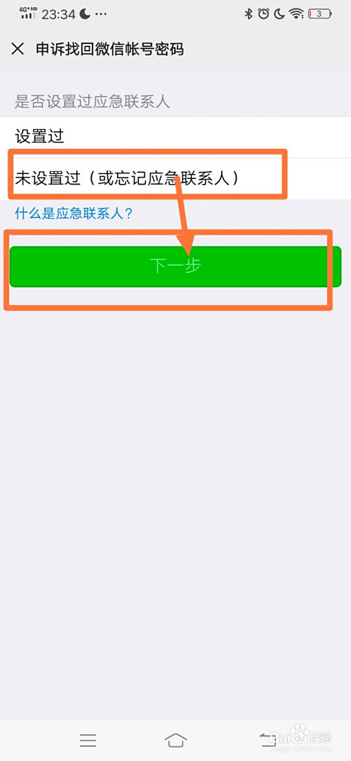 在弹出的页面中,按要求选择是否设置过应急联系人,再点击“下一步”,接着期待申诉进度即可。