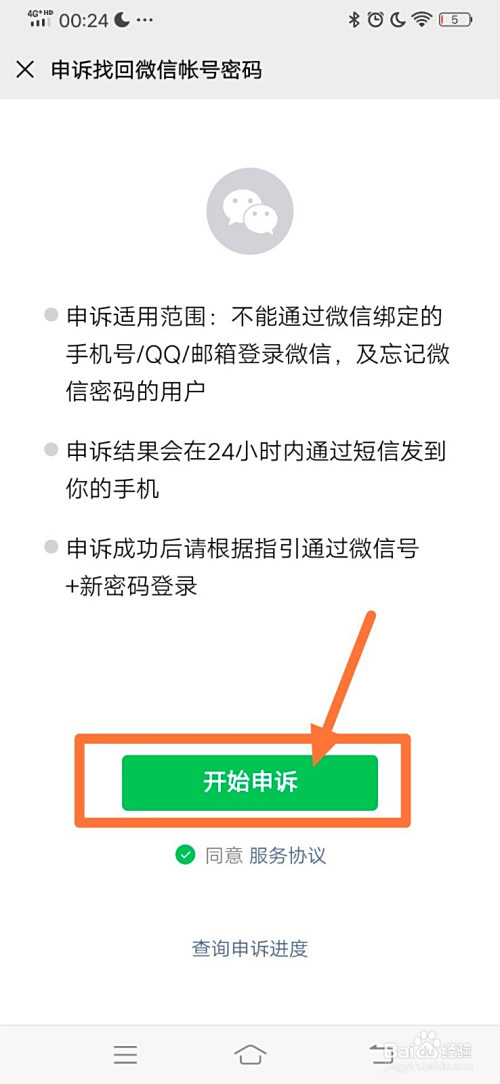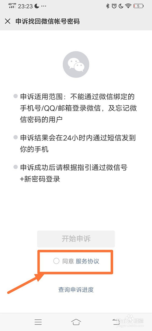 接着点击“申诉找回微信帐号暗码”,勾选“赞成和谈”后,点击“起头申诉”;