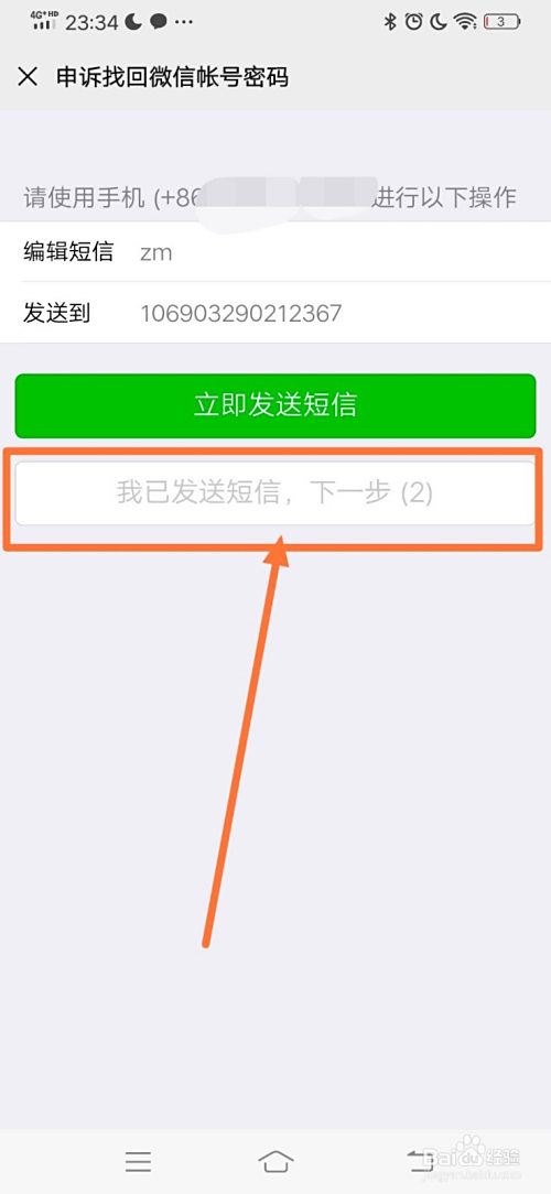 按照页面要求,用新手机号码发送短信,确认已用新手机号码发送短信后,接着点击“我已发送短信,(下一步)”;