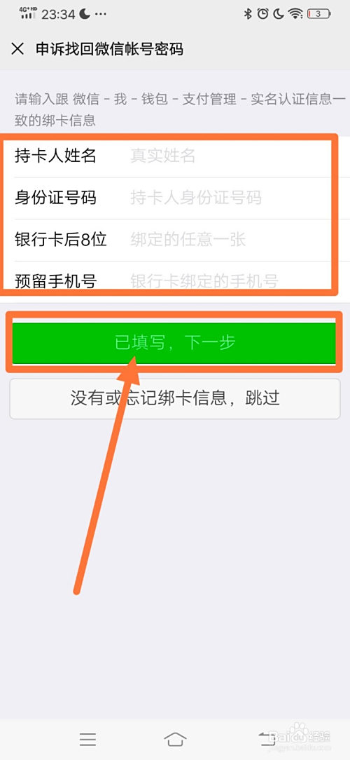 接着在页面中,按照要求填入原微旌旗灯号绑定的银行卡有关的信息,点击“已填写,下一步”;