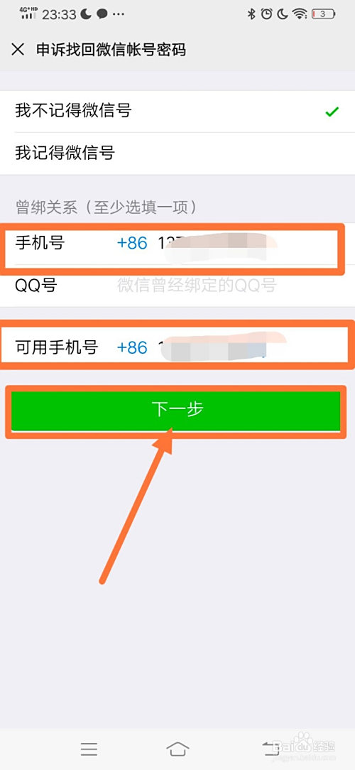 如选择“我不记得微旌旗灯号”,在页面中,输入曾邦关系,如手机号或QQ号,再输入可用的手机号,点击下一步;