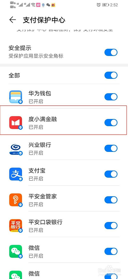 4.点开“支付庇护中间”,在该界面找到“度小满金融”,将厥后边的开关条封闭即可。