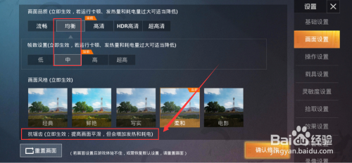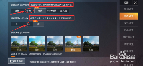 3、【画面设置】【帧数设置】过高城市导致手机发烧卡顿,将它们设为【平衡】【中】