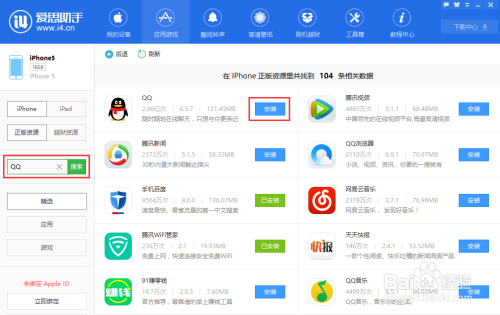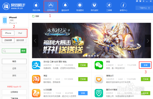 1.打开助手PC端,毗连苹果手机到电脑,搜刮软件;