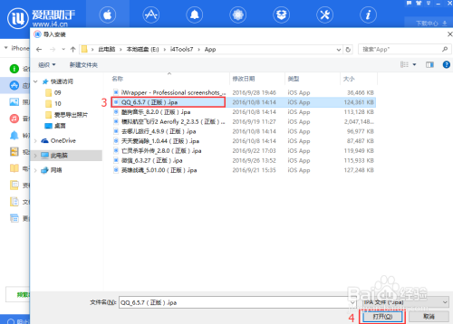 在弹出框中选择已下载的软件安装包,点击“打开”,该软件将被安装到苹果手机中。