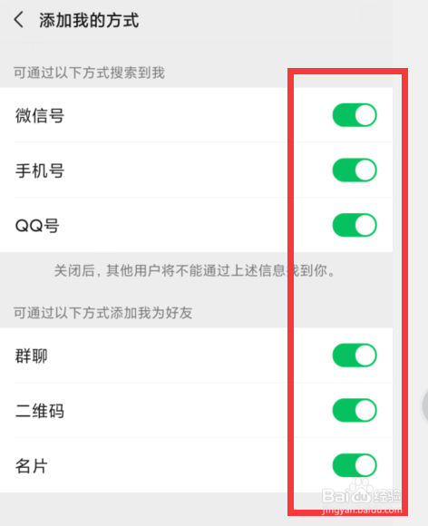 在弹出的页面中就可以点击开启微旌旗灯号、手机号、QQ号和群聊等体例,这样就能经由过程QQ号或者手机号、群聊添加本身为老友。