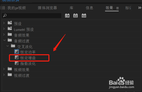 找到“恒定增益”,用鼠标拖动“恒定增益”到音几次道所选的时候点上。“恒定增益”音频过渡结果就完当作了。