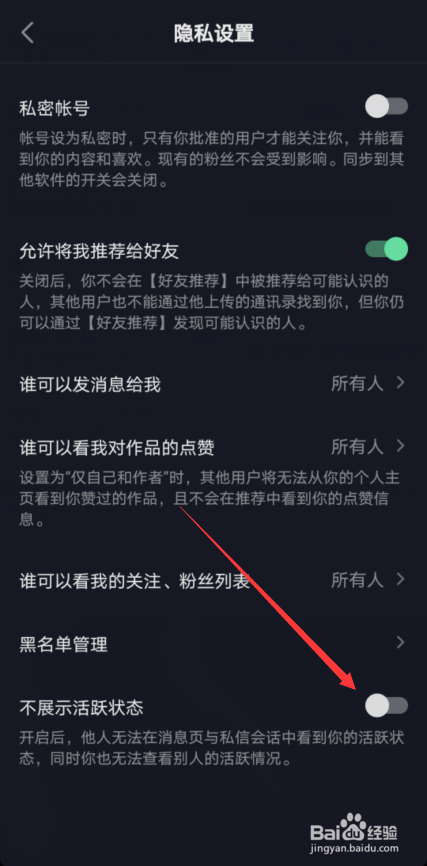 第五步,点击进入到里面,最下面有一个【不展示活跃状况】,点击后面的开启就可以不显示您的在线了。