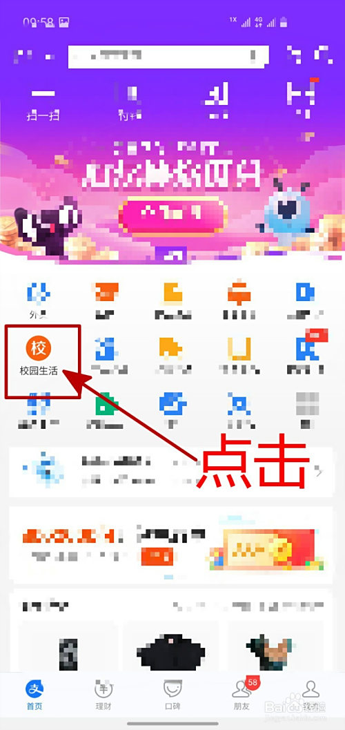 在支付宝APP首页,点击“校园糊口”。
