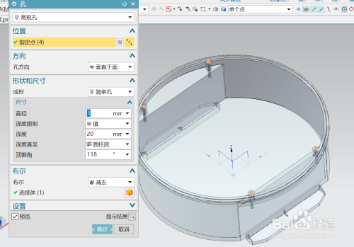 选用孔号令,别离选择上步拉伸的4个圆柱端面圆心作为定点,开孔的直径为3,深度为20;如图所示。