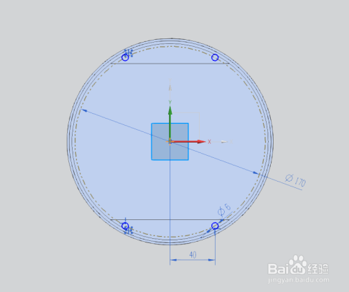 选用拉伸号令,以XY面作为平面以壳体内台阶高度作为定点进行草绘截面线;草绘内涵直径为170的圆弧上绘出四个直径为6的圆形;如图所示