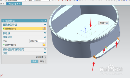 选中三个增强筋,用镜像特征号令,以XZ面为镜像平面进行镜像。使模子的另一面也获得三个增强筋;如图所示。