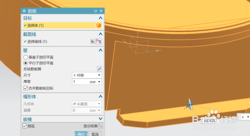 建立筋板对话框中,勾选平行于剖切平面,厚度为1;即可建立出一道增强筋。如图所示。