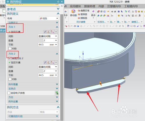 选中建立的增强筋,用线性阵列的体例,别离标的目的X轴正负偏向阵列一个增强筋,数目为2节距为44.5;如图所示。