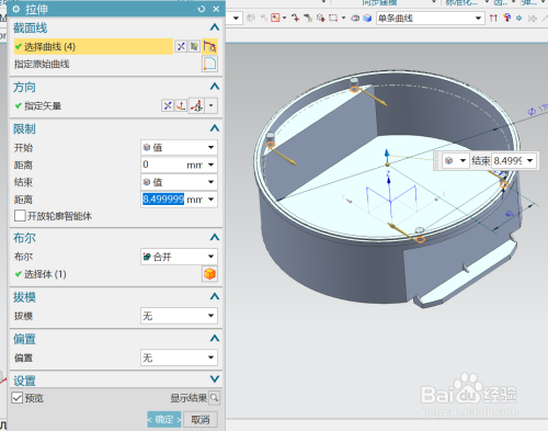拉伸对话框内,将拉伸距离更改为8.5,布尔为归并。如图所示。