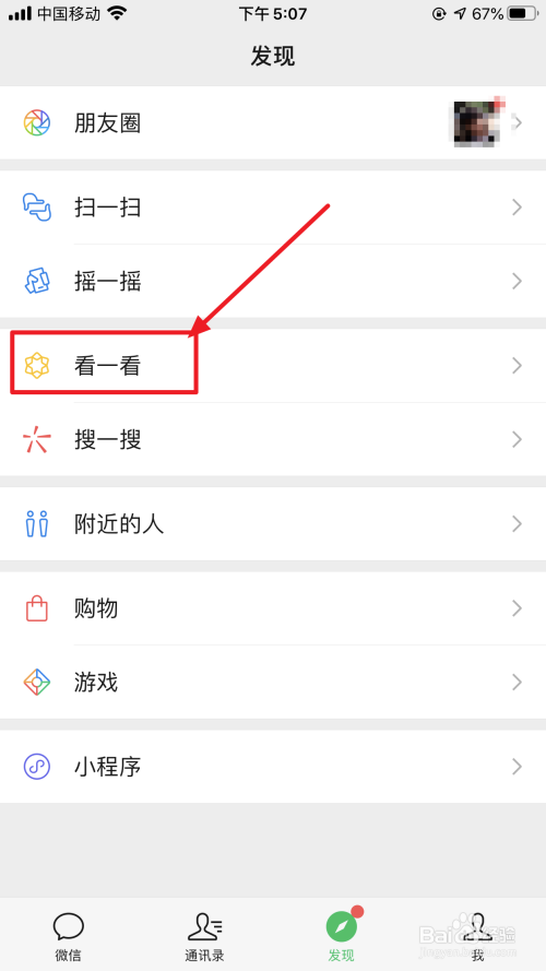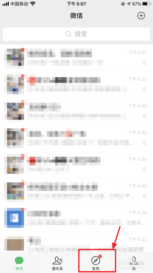 点开微信,点击下方的“发现”,如下图。