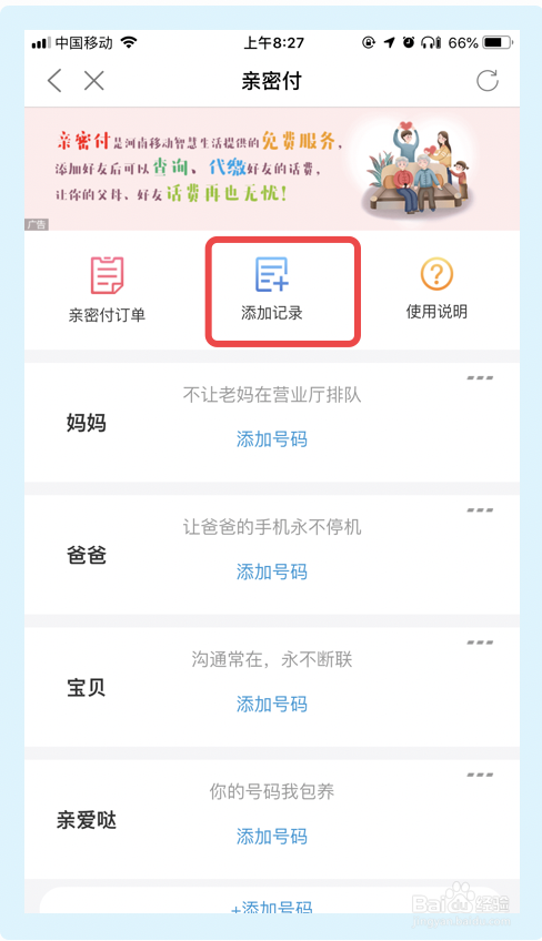 5.点击【添加记实】,完当作以上步调河南移动app即可查询亲密付的添加记实。