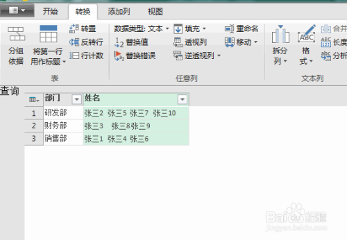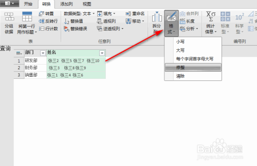 接着,选中姓名列,并在“转换”选项卡下点击“格局”下的修整,具体如图所示: