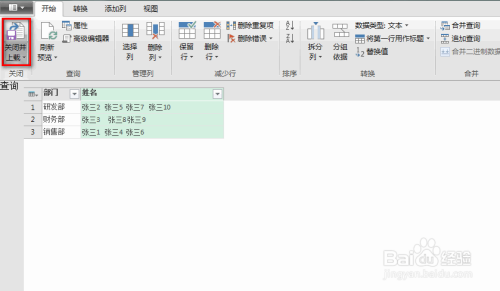 然后点击“起头”选项卡下点击“封闭并上载”,最后数据会加载到表格中,具体如图所示: