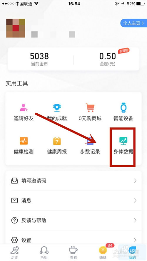紧接着点击我的页面中的身体数据选项。