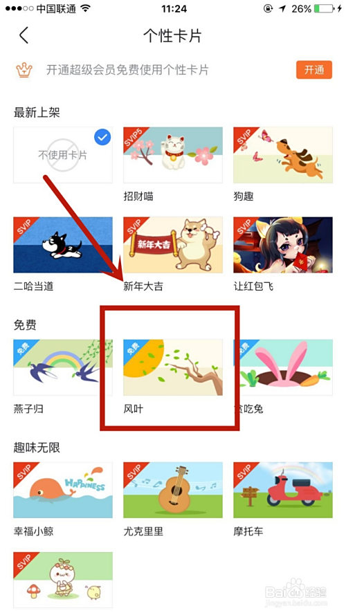 2.点击个性卡片,找到本身喜好的样式后点击进入。
