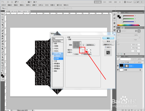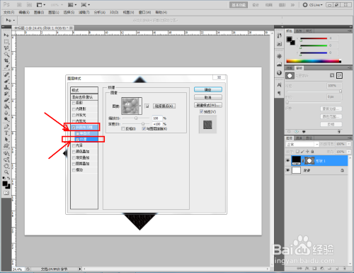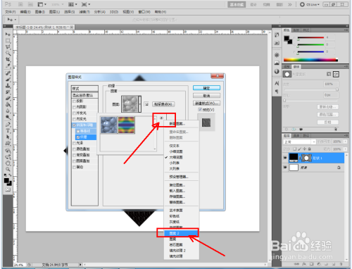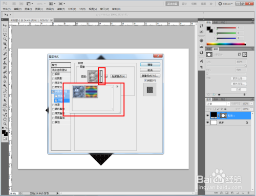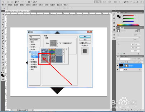 双击图示自界说图案图层,弹出图层样式设置栏。勾选【斜面和浮雕】-【纹理】,点击图示小三角,弹出图案选项栏;