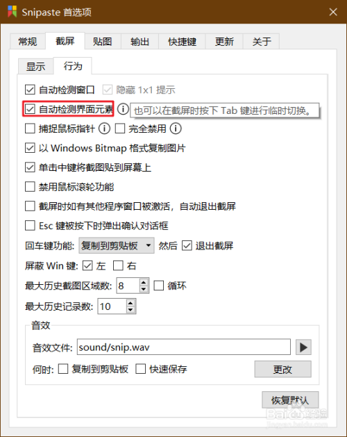 1- 在Snipaste设置中,打开(启用)“主动检测界面元素”选项;
