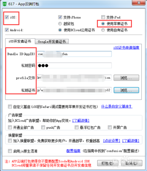 选择iOS打包,撑持的设备类型(可以选择撑持iPhone和撑持ipad),选择利用苹果证书