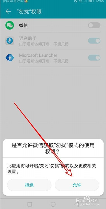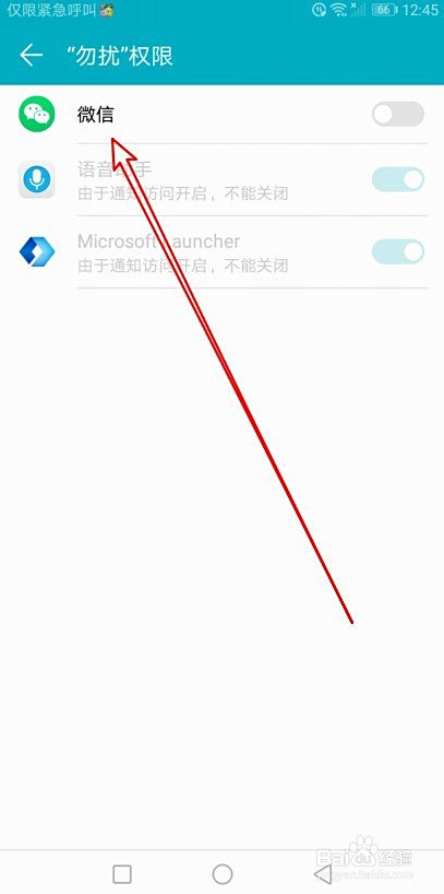 接下来再打开的勿扰权限页面,找到微信的设置项。