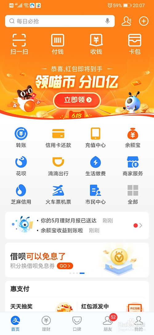 进入支付宝首页之后,点击一下本家儿界面的转账。