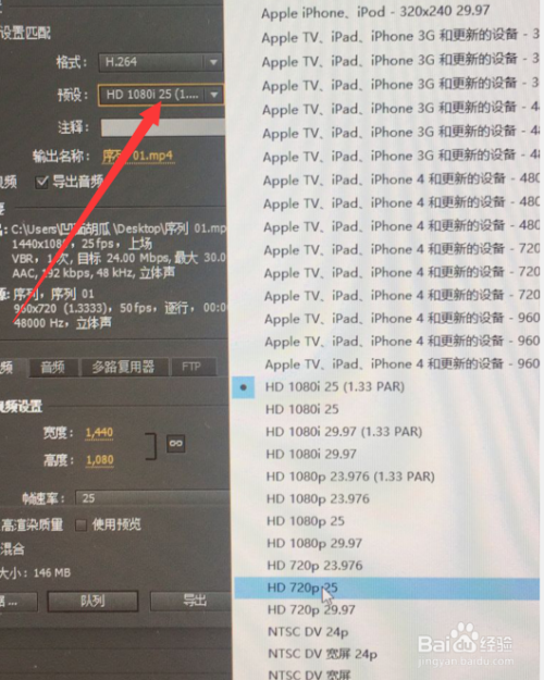 在导出的预设选项中选择“HD 720p25”,然后点击下方“导出”按钮即可。
