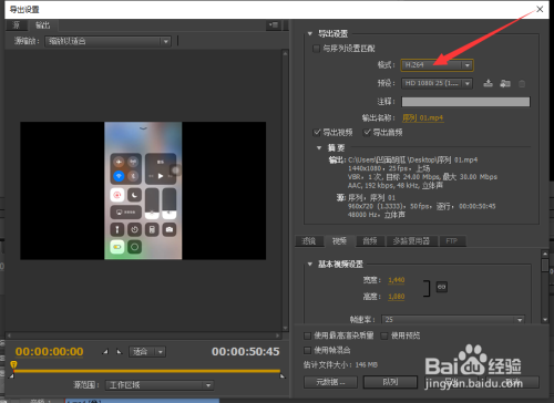在导出的格局选项中选择“H.264”。