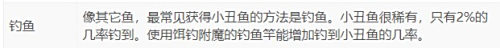 小丑鱼(Clownfish)是能经由过程垂钓获得的食物,食用后可以或许恢复1点饥饿度。小丑鱼不克不及被放入熔炉进行烹调。它仅用于作为食物或顺服豹猫,可是作为食物来说它比其他鱼类更低效(只能恢复1体力)。小丑鱼也相对难钓到。