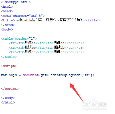 2、在js内,经由过程行标签tr名称,利用getElementsByTagName()方式获得行对象。