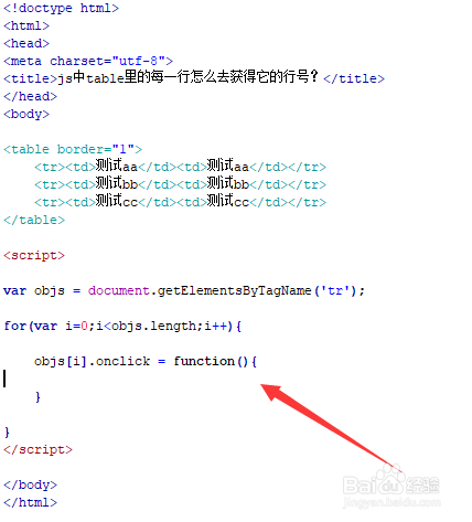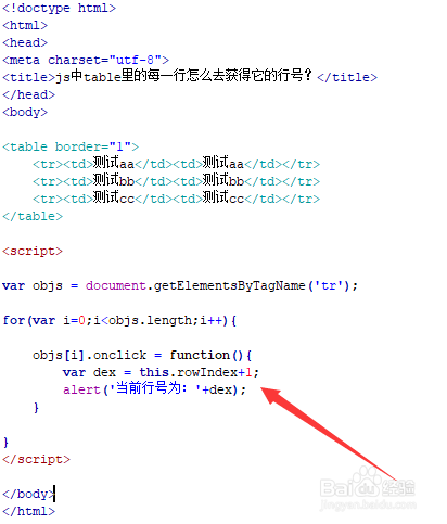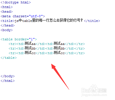 新建一个html文件,定名为test.html,用于讲解js中table里的每一行怎么去获得它的行号。
