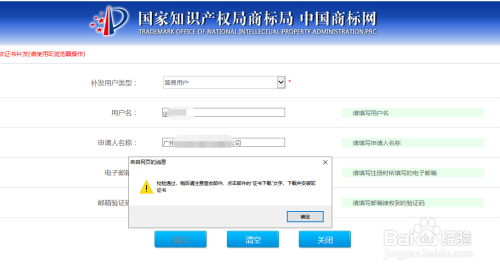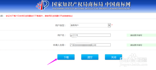 弹出的页面输入用户名和申请人名称后,点击下载,下载后会提醒获取当作功。