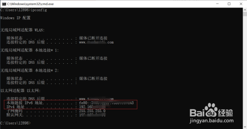 在里面输入 ipconfig,然后敲回车键,就会看到ip地址