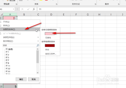 然后,进行筛选,再点击下【按单位格颜色排序】选项。